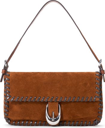 Polished logo hardware, leather whipstitching and a rich suede exterior distinguish a structured shoulder bag fitted with an adjustable strap for versatile styling.