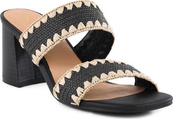 Contrast stitching accentuates the woven straps of this earthy yet sophisticated sandal set on a lofty block heel.