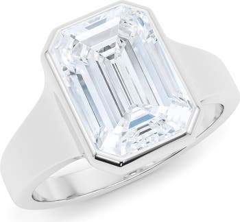 A bold bezel setting is imbued with shine by a lab-grown diamond featuring a vintage-inspired emerald cut in this classic ring.