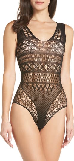 A mix of patterns enhances the sultry allure of this barely there lace bodysuit.