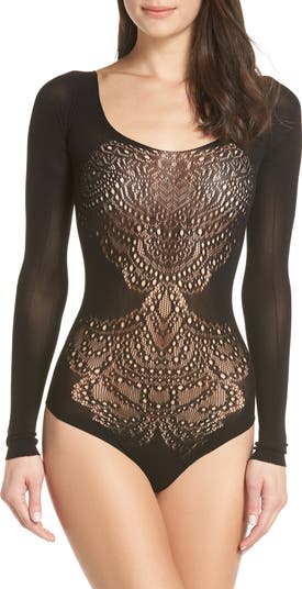 An intriguing lace pattern and cutout back enhance the allure of on this barely there long-sleeve bodysuit.