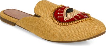 Sparkling crystals, beads and artful embroidery punctuate this handcrafted mule designed with a pointy toe and delicately dipped topline.