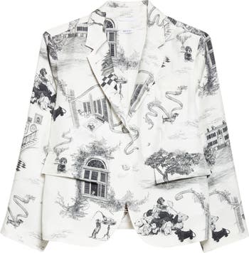 In celebration of Hector’s tenth year as a brand icon, this silk twill jacket features a highly personal tableau that is part portrait, part pastoral dream. The print draws elements from Thom Browne’s own upstate world, depicting the beloved dachshund in a series of whimsical vignettes across the piece’s tailored silhouette. A tricolor grosgrain loop at the back collar and ribbon inside the cuff plackets bring signature brand touches.