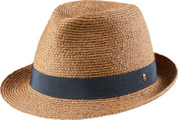 A grosgrain band circles a UV-blocking, breezy raffia fedora finished with a tiny, gleaming logo charm.