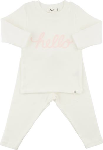 Surprise your loved ones with this playful, oh-so-cute two piece set! Perfect for revealing your pregnancy or bringing baby home in style. The long sleeve tee features a pale pink embroidered "hello", while the coordinating pants complete the look. Keep your little one stylish and comfortable in this ensemble. Available in infant sizes. Designed in Minnesota.