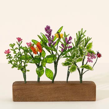 Celebrate summer s bounty with this cheery herb bed, sculpted from shimmering fragments of recycled glass. Light- and eye-catching herb blossoms and insect friends add lively to the brilliant foliage. The artful culinary stars have symbolic meanings: thyme courage, basil protection, lavender devotion, rosemary love, and oregano joy. The herbs are firmly planted on a handsome alderwood base. Handmade in the Philippines.
