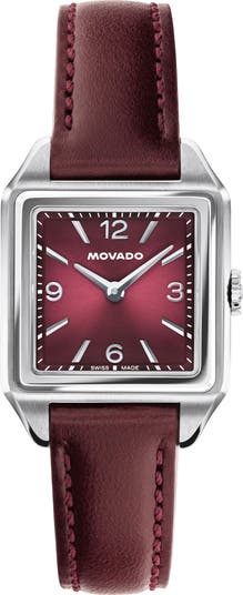 After a century of iterations, Movado revives this petite square watch from the art deco era. Centered with a sunray dial and set on an adjustable leather strap, it s punctuated with a floral-embossed crown straight from the archives.