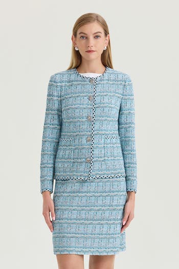 Refined and timeless, this tweed knit jacket embodies classic Ming Wang craftsmanship. The jewel neckline, soft shoulder pads, and bust darts create a polished silhouette, complemented by functional pockets and elegant signature Ming Wang buttons. Perfect for the office or luncheon, it pairs effortlessly with the matching skirt or pant for a sophisticated head-to-toe look. Heritage Fit: This iconic signature silhouette drapes elegantly from the shoulders, gently skimming the body to enhance and flatter all body types. This silhouette is generously sized; if you re in between sizes, we recommend ordering one size down for a better fit. Wrinkle-Resistant Tweed Knit Jacket Petite Size PXS is 22". Length May Vary. Jewel Neck; Signature Ming Wang Button Front; Long Sleeves (23") Soft Shoulder Pads; Functional Pockets; Bust Darts; Contrast Braided Trim Detail Fade Stretch Resistant to Hold Its Shape and Color 60% Acrylic / 26% Nylon / 14% Rayon; Unlined Machine or Hand Wash in Cold Water; Do Not Bleach Lay Flat to Dry; Iron with Low Temperature Inside Out