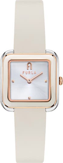 A rose gold–framed rounded-square case adds unique polish to this minimalist watch marked simply by three dot indices and the iconic arch logo at the 12 o clock position.