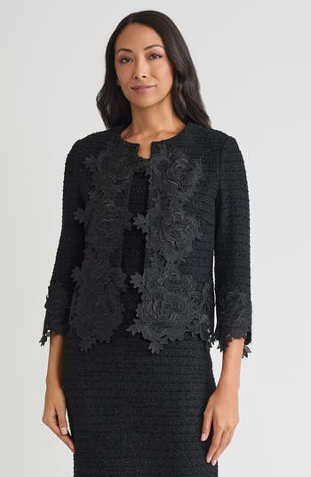 Intricately designed floral lace appliqués trace the front and sleeves, adding dimension and romance to its refined knit texture. With its open-front silhouette and 3/4 sleeves, this sophisticated jacket transitions effortlessly from polished daytime events to evening occasions with enduring grace.