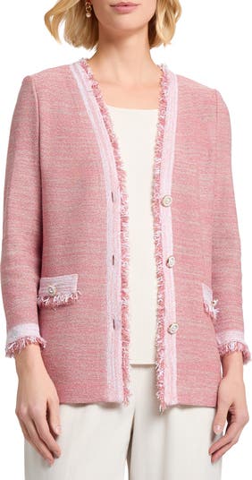 The perfect travel companion is a wrinkle-resistant jacket flickered in fringe and shaped with soft shoulder pads.
