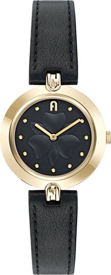 This sleek watch features the brand s signature arch-logo hinges, a richly grained, topstitched leather strap and a tonally embossed flower in full bloom at the center of the minimalist dial.