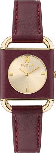 A leather-wrapped square bezel adds unique polish to this minimalist watch marked simply by three dot indices and the iconic arch logo at the 12 o clock position.