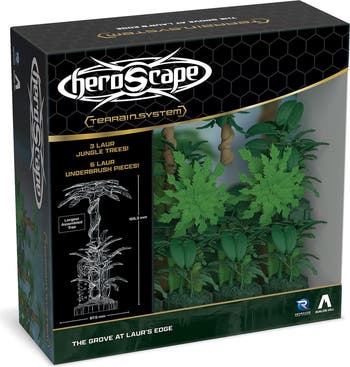 HEROSCAPE: THE GROVE AT LAUR’S EDGE TERRAIN EXPANSION - THE BATTLE OF ALL TIME - Nestled at the edge of Valhalla’s grand Laur Jungle, a grove of dense foliage stands, its greenery inviting yet foreboding. Though currently deserted, the impending call of battle will pierce even this tranquil haven. Whatever lurks behind the swaying branches will prove far less amicable than the trees themselves. Build new jungle environments over which to battle for Valhalla in HEROSCAPE: THE GROVE AT LAUR’S EDGE. This terrain set includes 3 Laur Jungle trees, 6 Laur Jungle Underbrush pieces, and a setup guide to maximize your use of these striking new terrain features. This set is fully compatible with all Heroscape Master Sets and Expansions! HEROSCAPE and HASBRO and all related trademarks and logos are trademarks of Hasbro, Inc. 2024 Hasbro. EXPANSION PACK: Requires core game to play. At a Glance: For Ages: 14+. Game Type: Board Game Accessory Add-on