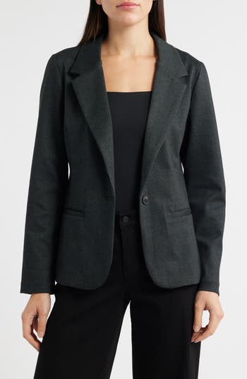 A subtle herringbone pattern elevates the style of this stretchy, one-button blazer made with princess seams that create a shapely, fitted silhouette.