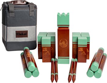 - *Solid hevea wooden game pieces *Vibrant color *Premium travel carry bag *Includes ten knights, one king kubb, six throwing dowels, four court stakes