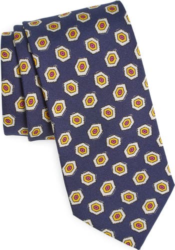 Scattered geometries enliven a tie that s crafted from polished silk and styled to brighten any semiformal look.