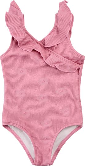 They ll look their most precious in this jacquard one-piece swimsuit featuring dimensional blooms and sweet ruffles.