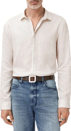 Trios of stripes elevate this button-up cut from a fine fabric that gives this style a supple drape that s nearly as intriguing as its allover pattern.