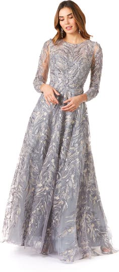 This is a full-length, tulle fabric, long dress with a V neck long flutter sleeves. It is embellished with seed beads and pearls. Perfect for the guest of a wedding, or a formal dinner with that elegant, refined look.