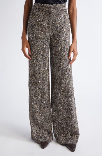 A salt-and-pepper tweed flecked with autumn hues provides rich bouclé texture to these wide-leg pants designed with a fair amount of warming wool.