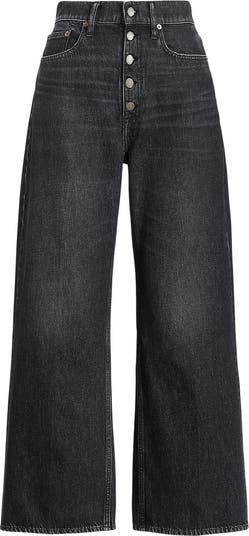 These wide-leg jeans in a faded and whiskered dark wash are cut from soft nonstretch denim and have an exposed button fly for a fresh look.