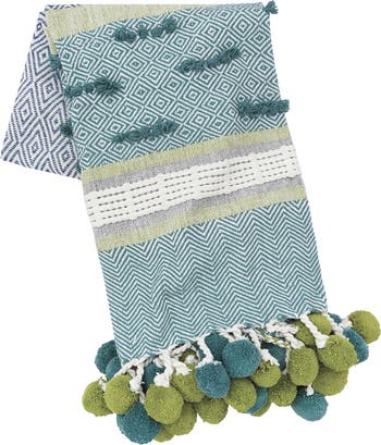 The Highland Throw s collection of ladder woven diamond, chevron, and striped patterns punctuated by textured bundles of yarn gives it a fun and dynamic style. This decorative cotton throw is finished with a bold, confident tassel and pom pom fringe in bright citron and teal, coordinating with modern on-trend styles.