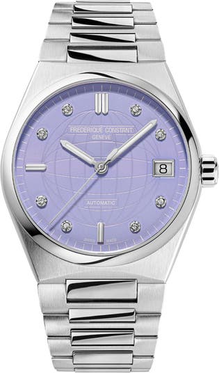 Precision automatic movement with a 38-hour power reserve highlights the sparkling Swiss craftsmanship of this diamond-detailed timepiece fitted with a mixed-texture bracelet composed of contrasting brushed and polished stainless steel links.