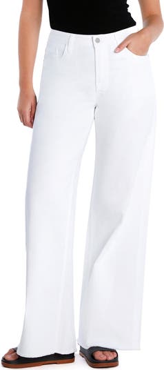 Raw hems refresh the retro style of elongating wide-leg jeans crafted from faded low-stretch denim.