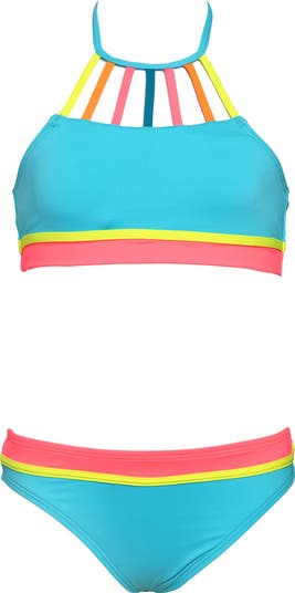 Your kiddo will be all smiles in this two-piece swimsuit that s styled with a strappy halter-style top and colorful accents.