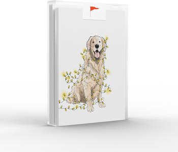 This 8-pack of greeting cards is elegantly illustrated by artist Ingrid Ramus, founder and owner of the Ramus Co brand. Artwork features a golden retriever wearing holiday lights. All greeting cards are made in the USA on heavyweight uncoated and locally-sourced and manufactured card stock. Each card is accompanied by a hand-embossed envelope made with heavyweight 95lb paper and a peel-and-stick flap - no licking envelopes here! All Ramus Co. greeting cards are printed on FSC and SFI certified paper sourced from a regional mill that harnesses 66% of its energy from on-site sustainable sources, such as emission-free hydroelectricity and biomass co-generation from wood waste. All 8 greeting cards come packaged as a boxed set. Husband-and-wife team Calvin and Ingrid Ramus founded Ramus Company in 2019, in New England, USA. Ingrid, the creative designer behind the brand, originates from Mexico, where she cultivated her skills in fashion and textile design. Drawing from her unique and inquisitive perspective on preppy style, Ingrid prolifically designs whimsical yet classic stationery and lifestyle items.