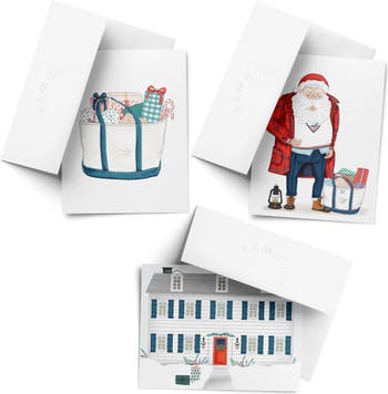 This 3-pack of assorted winter/holiday greeting cards is elegantly illustrated by artist Ingrid Ramus, founder and owner of the Ramus Co brand. Card 1 front artwork: Preppy santa with tote bag filled with presents, Blank inside. Card 2 artwork: New England winter home, Blank inside. Card 3 artwork: Preppy tote bag filled with presents, Blank inside. All greeting cards are made in the USA on heavyweight uncoated and locally-manufactured card stock. Each card is individually wrapped in TUV Austria certified-compostable PLA sleeves that meet both ASTM D6400 EN 13432 standards. Each card is accompanied by a hand-embossed envelope made with heavyweight 95lb paper and a peel-and-stick flap - no licking envelopes here! All Ramus Co. greeting cards are printed on FSC and SFI certified paper sourced from a regional mill that harnesses 66% of its energy from on-site sustainable sources, such as emission-free hydroelectricity and biomass co-generation from wood waste. Additionally, our greeting cards are thoughtfully packaged in bags made from certified compostable PLA material. Husband-and-wife team Calvin and Ingrid Ramus founded Ramus Company in 2019, in New England, USA. Ingrid, the creative designer behind the brand, originates from Mexico, where she cultivated her skills in fashion and textile design. Drawing from her unique and inquisitive perspective on preppy style, Ingrid prolifically designs whimsical yet classic stationery and lifestyle items.