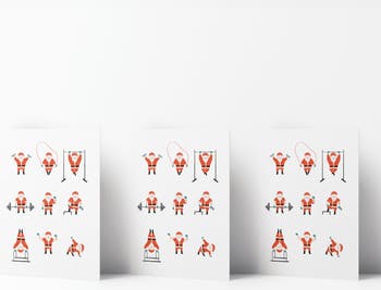 This 3-pack of winter/holiday greeting cards is elegantly illustrated by artist Ingrid Ramus, founder and owner of the Ramus Co brand. Front artwork features Santa working out. The cards are blank inside. All greeting cards are made in the USA on heavyweight uncoated and locally-manufactured card stock. Each card is individually wrapped in TUV Austria certified-compostable PLA sleeves that meet both ASTM D6400 EN 13432 standards. Each card is accompanied by a hand-embossed envelope made with heavyweight 95lb paper and a peel-and-stick flap - no licking envelopes here! All Ramus Co. greeting cards are printed on FSC© and SFI© certified paper sourced from a regional mill that harnesses 66% of its energy from on-site sustainable sources, such as emission-free hydroelectricity and biomass co-generation from wood waste. Additionally, our greeting cards are thoughtfully packaged in bags made from certified compostable PLA material. Husband-and-wife team Calvin and Ingrid Ramus founded Ramus Company in 2019, in New England, USA. Ingrid, the creative designer behind the brand, originates from Mexico, where she cultivated her skills in fashion and textile design. Drawing from her unique and inquisitive perspective on preppy style, Ingrid prolifically designs whimsical yet classic stationery and lifestyle items.
