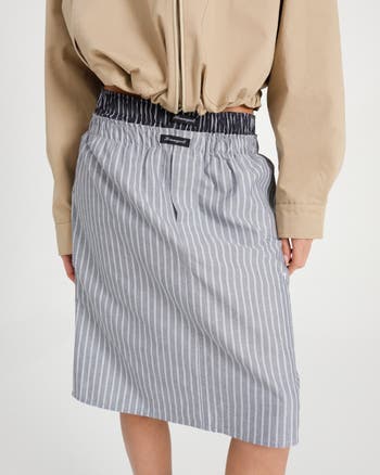 Boxer-style pencil skirt in yellow stripe oxford. Featuring black signature logo label on waistband. Embroidered with our Hg monogram in navy.