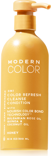 Modern Color’s Honey 3-in-1 Color Refresh + Cleanse + Conditioner delivers a warm honey / strawberry-blonde tone while cleansing and conditioning in one step. This semi-permanent formula lifts hair color, enhances shine, and nourishes strands from root to tip. It keeps blonde-hued and lightened hair radiant and soft between salon visits without compromising hair health.