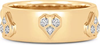Honeycomb hearts illuminated by pavé diamonds enrich a polished band ring crafted from warm 18-karat gold.
