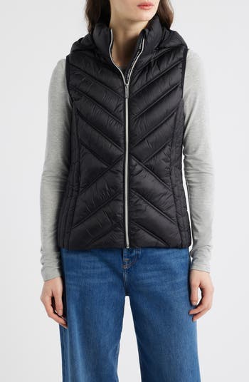 A removable hood enhances the versatility of a chevron-quilted vest featuring a cozy stand collar, secure zip pockets and lightweight down-alternative fill.