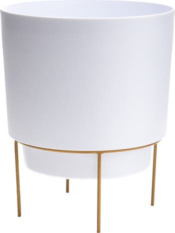 BLOEM HOPSON PLANTER W/ METAL GOLD STAND: 14" - CASPER WHITE - Durable resin pot for indoor out use. Gardening. Add some modern, mid-century flair to your home office with the Hopson Planter by Bloem. The planter is crafted from polypropylene plastic resin, so it is durable and can be used indoors and outdoors. It s great for drop-in nursery pots, so give your snake plant the vessel it deserves without having to transplant it. The pot has a sealed base for indoor use with drill-out drainage if used outdoors. The included and detachable metal stand is powder-coated and rust-resistant for year-round use. MADE IN THE USA: This product is proudly made in the United States.