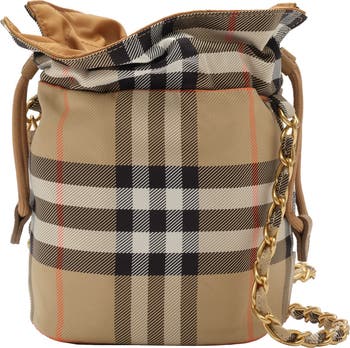 Inspired by country pursuits, a softly structured Horseshoe pouch in a quilted nylon blend with a Burberry Check lining. The design is detailed with leather trims and our Knight stamp, an archival motif first seen on Burberry bags in the 1980s. Carry crossbody or on the shoulder with the chain strap, intertwined with Burberry Check.||Chain strap|Drawcord closure|Hand-painted edges|Brushed metal hardware|Leather patch with Equestrian Knight Design at front|Burberry Check lining|Comes with a dust bag