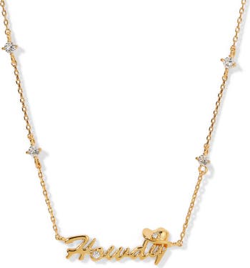 Round cut cubic zirconia bring enchanting shimmer to a dainty choker necklace popped with a playful Howdy pendant.