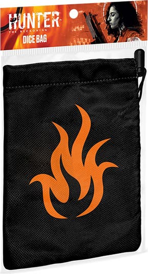 Hunter: The Reckoning 5th Edition Roleplaying Game Dice Bag - Keep your dice and other gaming accessories at hand in this premium quality Hunter: The Reckoning themed dice bag! The iconic flame is featured on this dice bag, perfect for use while playing your Hunter story. Featuring high quality construction with a soft fabric exterior and protective liner, along with a locking drawstring clasp, your dice will be safe and secure. Features the iconic flame symbol! High quality, double-lined fabric! Locking drawstring clasp secures your accessories inside the bag. Soft interior liner keeps dice scratch-free and safe. Measures 6.25" x 8.5" when flat.