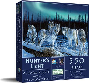 Ignite your puzzle-making passion with SunsOut s Hunter s Light 550 piece jigsaw puzzle. This masterpiece, renowned for the awe-inspiring artistry of Des McCaffrey, invites puzzle enthusiasts into a tranquil winter scene filled with majestic wolves bathed under a starlit sky. The captivating scenery, depicted with utter brilliance, is perfectly sized at 15" x 24", providing an ideal opportunity to showcase nature s beauty. The interlocking puzzle pieces, crafted meticulously for a smooth assembly, are made from high-quality recycled cardboard, ensuring a spectacular puzzle-building experience. Embodying values of sustainability, SunsOut puzzles use eco-friendly soy-based inks and premium recycled board. This product exhibits our commitment to the environment and is proudly made in the USA by our woman-owned small business that adheres to top-tier manufacturing standards. Coupled with our worry-free guarantee that ensures quick resolution to any issues regarding missing or damaged pieces, this jigsaw puzzle offers an unparalleled customer experience. The Hunter s Light jigsaw puzzle serves as the perfect gift for adults seeking relaxation and mental stimulation, triggering an appreciation for nature s tranquility while enhancing problem-solving skills. Add this jigsaw puzzle to your collection and discover the enchanting beauty of winter while crafting a visually stunning piece of art, reminiscing about the wonders of the untouched wilderness.