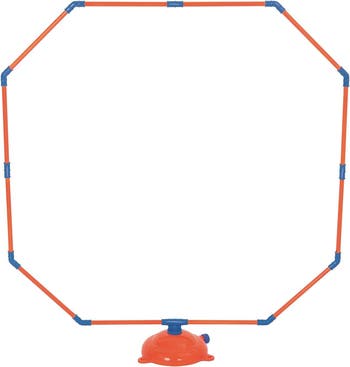 H2OGO! HYDRO HOOP WATER SPRAYER SPRINKLER - Make outdoor play a splash hit with the H2OGO! Hydro Hoop Water Sprayer Sprinkler—a dynamic, rotating sprinkler designed to keep kids cool and entertained all summer long. With its modular, easy-to-assemble construction, this colorful sprinkler connects effortlessly to any standard garden hose, activating a continuous spray of water through interactive splash pads that shoot toward the center. The octagon-shaped hoop automatically rotates while spraying, adding motion and excitement to every game. Kids can run through the spinning sprinkler to play a fun "splash" challenge on their own or with friends, making it the perfect addition to backyard parties or sunny afternoons. Brightly colored in orange and blue, it’s designed for children ages 3 and up and provides a safe, engaging way to stay active outdoors. Whether it’s solo play or group fun, the Hydro Hoop offers endless water-blasting action with a quick setup that parents will appreciate. OVERVIEW: Easy to assemble; modular construction. For ages 3 and up. Orange and blue colored. Octagon shaped.