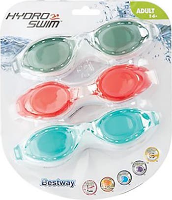 BESTWAY: HYDROSWIM GOGGLES - 3PK - Green, Red, Blue - Dive into every swim with comfort, clarity, and style using the Bestway Hydro-Swim Belize Goggles 3-Pack Set—a must-have accessory set for adult swimmers and snorkeling enthusiasts aged 14 and up. With three pairs of goggles in bold green, red, and blue, this set ensures you’re always prepared for pool days, beach adventures, or sharing with friends and family. Each pair features color-tinted polycarbonate lenses that include UV protection and anti-fog coating for crystal-clear underwater vision. The soft, comfort-fit eyecups provide a leak-resistant seal that stays gentle on your face, while the fully adjustable silicone head strap ensures a secure, customizable fit that stays in place no matter your stroke. Made entirely latex-free, these goggles are a safe and comfortable choice for swimmers with sensitivities. Whether you re doing laps, snorkeling, or just enjoying the water, the Hydro-Swim Belize Goggles Set delivers comfort, performance, and eye protection with every swim. OVERVIEW: Soft, comfort-fit eyecups. Color-tinted, polycarbonate lenses with UV protective coating. Anti-fog coating. Fully adjustable silicone head strap. 100 percent latex free.