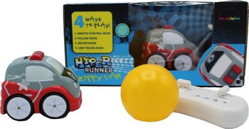 HYPER RUNNER: ZIPPY CAR - RC MINI CAR TOY. Not your normal RC car! Zippy Car comes with four modes: Escape Mode, Follow Mode, Tracing Mode and Standard remote control. Escape Mode: Sensors on the front and top of the car will sense you trying to grab it and escape from you. Follow Mode: Sensors on the front and top of the car will follow you or any object within 6 inches (following ball included). Tracing Mode: Use the included map or draw your own and Zippy car will follow the line you draw. Remote Control: Standard RC (front, Back, Left Right). Package includes: 1x Zippy Car, 1x Remote Control, 1x Follow Ball, 1x USB Charging Cord for the Car. Two AAA batteries required for remote control (not included).