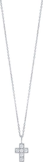 A petite cross detailed with six circular diamonds shines at the heart of this delicate pendant necklace crafted from 18-karat white gold.
