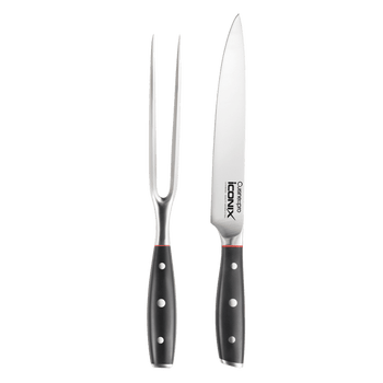 Perfect for slicing uniform portions of large roasts and other cooked meats, The Cuisine::pro® iconiX™ Carving set is perfect for carving and serving meats with ease. While the knife’s curved blade profile help to follow contours and guide meat away from the bone, the carving fork is perfect for holding meat in place while slicing and helps to transfer food to plate. The Cuisine::pro® iconiX® carving set is as beautifully designed as it is functional.