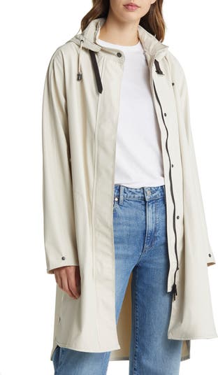 Cozy up on rainy days in this longline jacket furnished with a handy drawstring hood and flattering high-low hem to keep the elements at bay.
