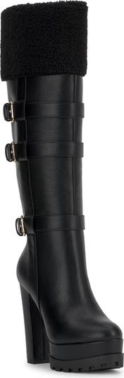 Bold buckle straps and a lofty platform sole amplify the modern edge of a knee-high boot topped with faux-shearling trim.