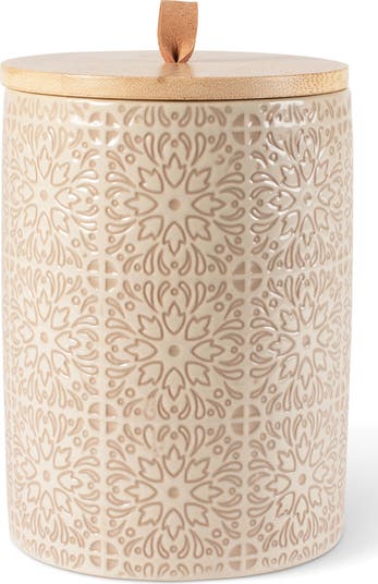 A suede tab handle in the bamboo lid and a tactile, debossed pattern make this treat jar a charming addition to your kitchen decor.